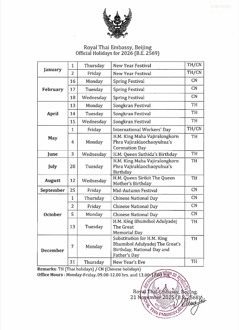 สถานเอกอัครราชทูต ณ กรุงปักกิ่งจัดกิจกรรมเนื่องในวันคล้ายวันพระบรมราชสมภพพระบาทสมเด็จพระบรมชนกาธิเบศร มหาภูมิพลอดุลยเดชมหาราช บรมนาถบพิตร วันชาติ และวันพ่อแห่งชาติ 5 ธันวาคม 2568
